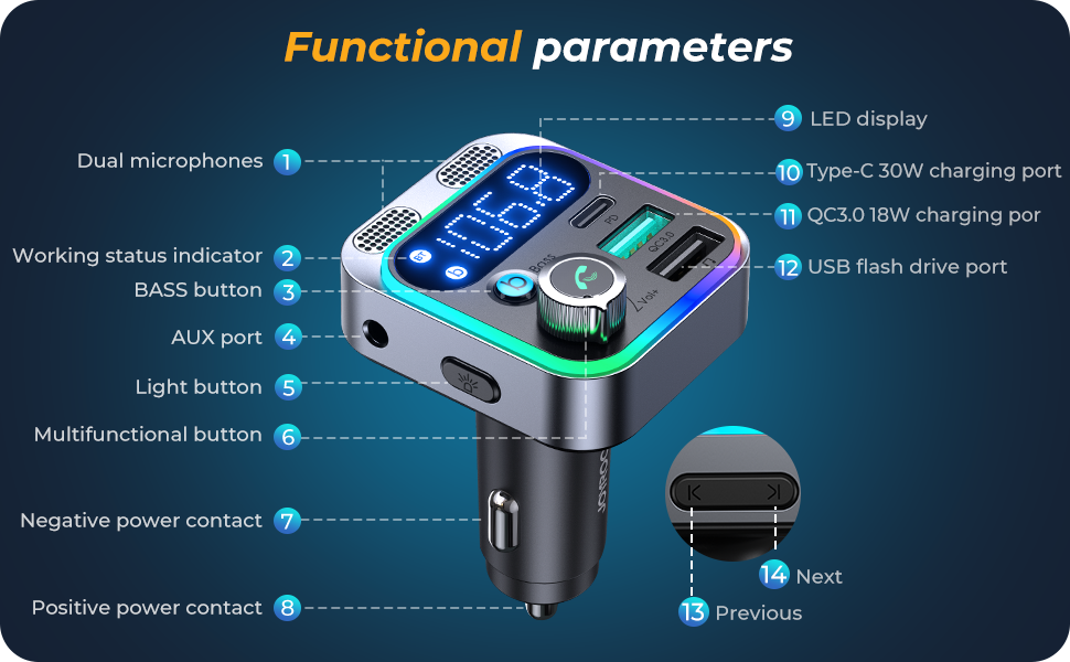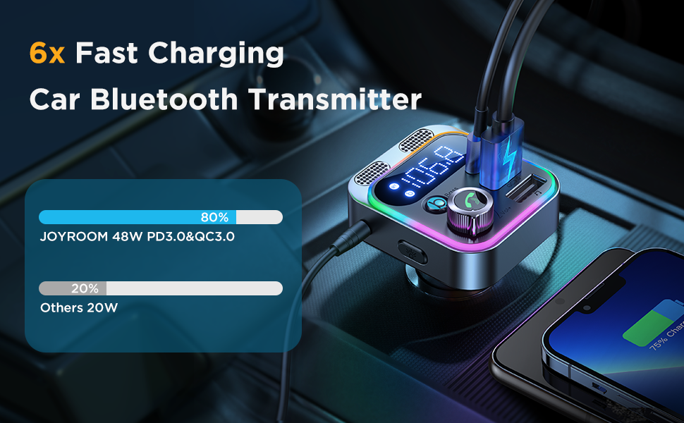 - 🚗 [48W PD&QC 3.0 Fast Charging]JOYROOM Bluetooth FM Transmitter is equipped with PD 30W Type-C and QC3.0 18W USB charging port, fast charging two devices at the same time. Support Samsung super fast charging and iPad pro/iPhone/Google/Moto/LG/Android device fast charging. This 48W high power car adapter charges faster than 99% of Bluetooth car adapters on the market