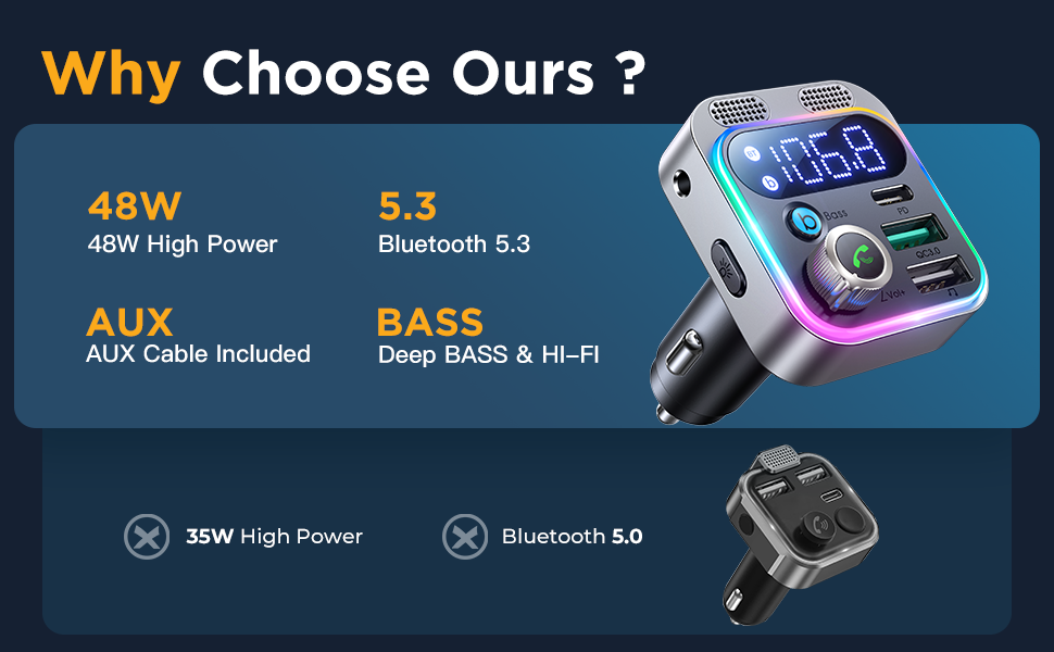 - 🚗 [Upgraded Bluetooth 5.3] JOYROOM FM transmitter uses the latest Bluetooth 5.3 technology, optimizing the transmission delay and connection defect problems of the old Bluetooth 5.1. Bluetooth 5.3 will bring you a faster, more stable, and smarter connection with less sound quality loss. Uninterrupted calls and music experience. It takes only 1 second to complete pairing, and no need to repeat pairing after the first successful pairing with your device